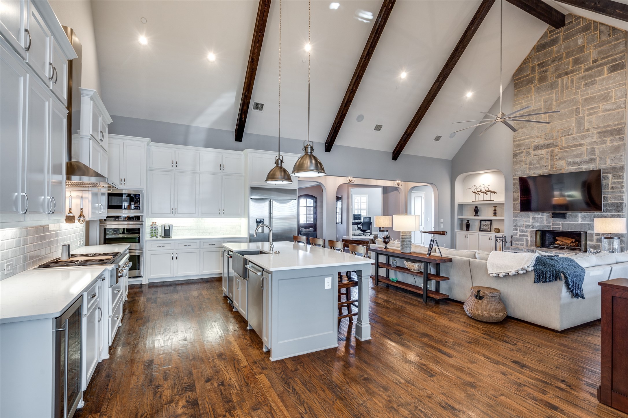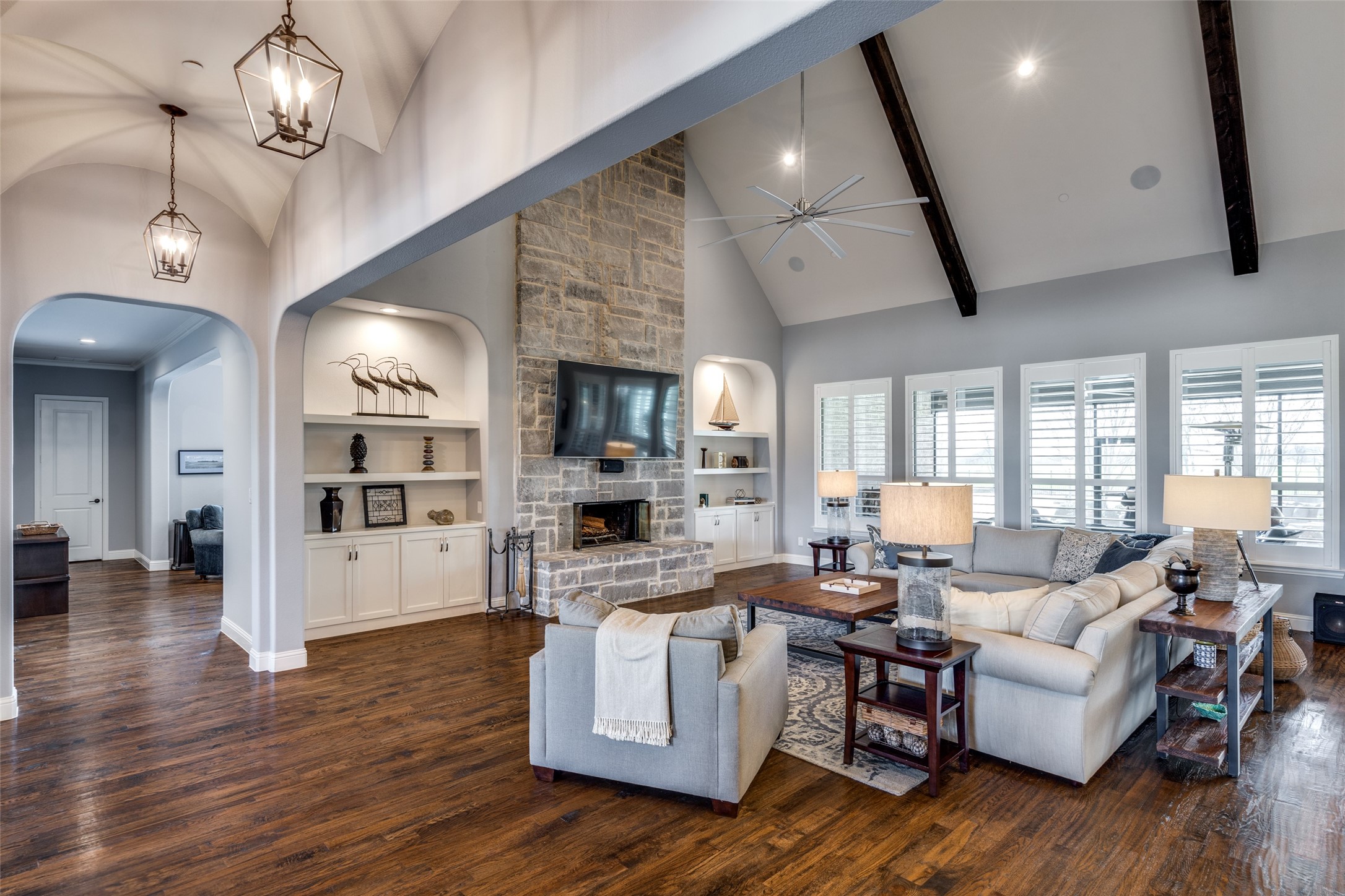 Nestled in a peaceful and upscale community that strikes the perfect balance between tranquility and convenience, this meticulously maintained 4-bedroom, 4 and a half bath Shaddock-built luxury residence is situated on a sprawling and generously landscaped 1-acre fully fenced lot. Elevated traditional charm and modern practicality in every corner with over $250k in upgrades invested into this beautiful estate. Cathedral beamed ceilings, built-in cabinets and shelves flank a soaring stone gas and wood burning fireplace in the grand living room with windows galore, plantation shutters, and true hardwood floors offering warmth and character. The chef's kitchen is well equipped, featuring quartz countertops and island, pot filler, double ovens, built-in refrigerator, trash compactor, and wine cooler. A serene primary suite with a sitting area, luxurious bath with a freestanding tub, an oversized walk-in shower with dual entry, separate vanities, and his and hers closets are the perfect luxury owners' retreat.